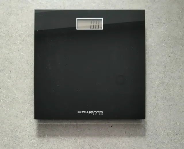 Detalles del productoBáscula de baño digital Rowenta con superficie de cristal templado negro.
