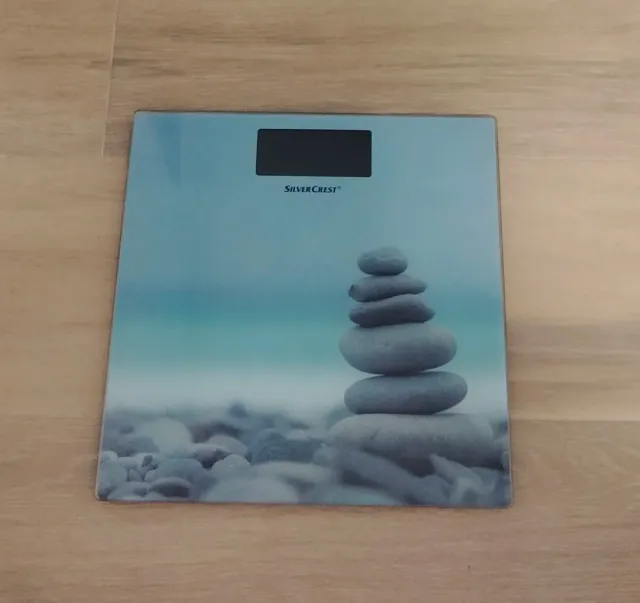 Báscula de baño SilverCrest con un diseño relajante de piedras apiladas. - Superficie de cristal. - Pantalla digital. - Diseño de piedras zen.