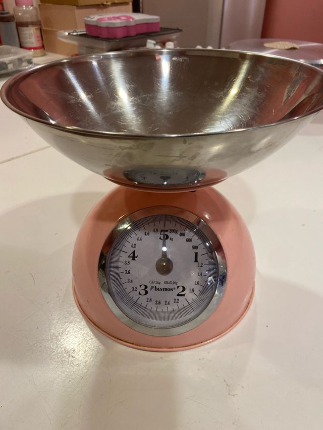 Báscula de cocina analógica de la marca Bestron. - Color rosa. - Capacidad de 5 kg. - Graduación de 20 g. - Diseño vintage.