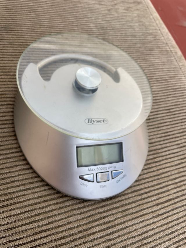 Báscula de cocina digital con superficie de cristal. - Capacidad máxima de 5000g. - Precisión de 1g. - Botones de unidad, tiempo y tara.