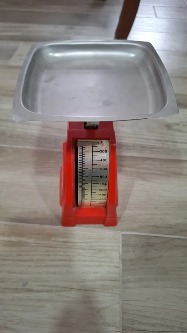 Báscula mecánica de cocina con bandeja de acero inoxidable. - Diseño clásico en color rojo. - Plato de acero inoxidable. - Escala de medición visible.
