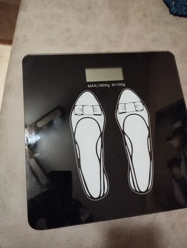 Báscula digital de baño con diseño moderno y superficie de cristal. - Indicador de peso en pantalla LCD. - Diseño con silueta de zapatos. - Máximo 180 Kg, precisión de 100g.