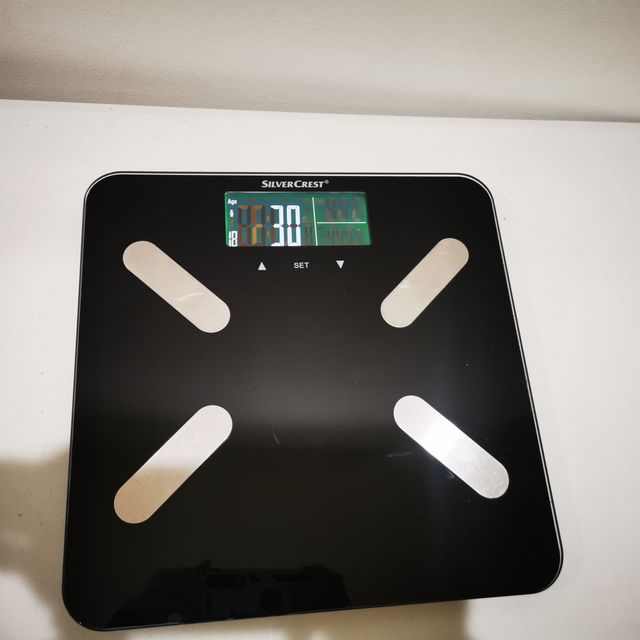 Detalles del productoBáscula digital SilverCrest para medir peso y grasa corporal con diseño moderno y superficie de cristal color negro con algún defecto o rayado del uso.