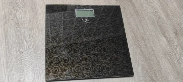 Detalles del productoBáscula digital Jata con superficie de cristal negro y diseño moderno.