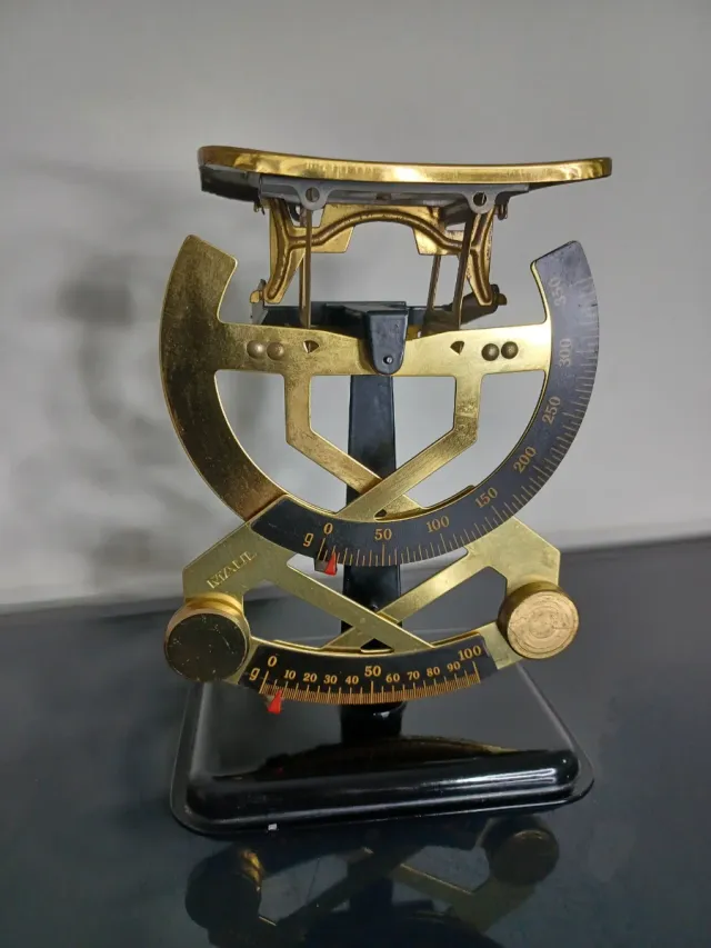 Detalles del productoExcepcional báscula postal MAUL (Alemania), encontrada en Niza, Francia. Un diseño robusto de latón pulido y base lacada, con un encanto industrial de los años 20-40.