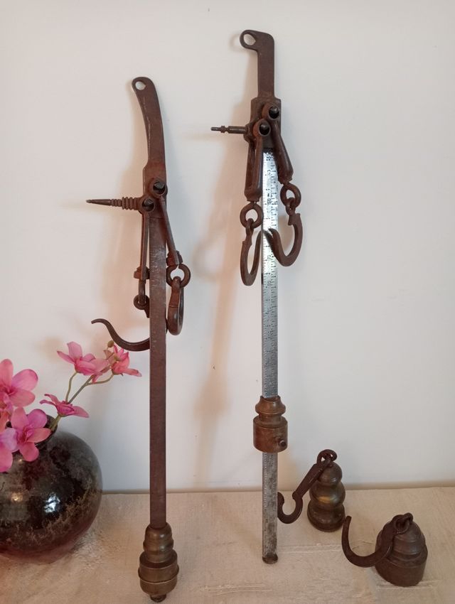 Detalles del productoDos básculas romanas antiguas con 2 pesos en buen estado.
