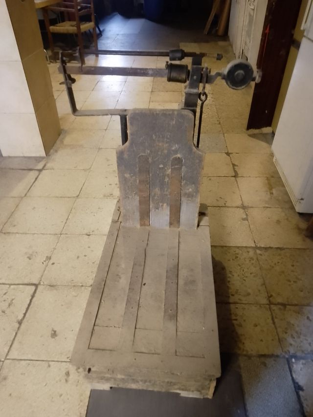 Báscula romana antigua de gran tamaño, ideal para coleccionistas o decoración. - Estructura metálica robusta. - Base de madera. - Mecanismo de pesaje visible.