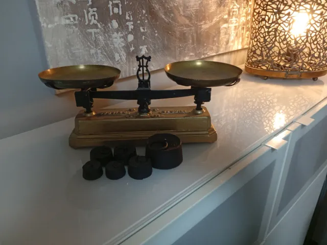 Detalles del productoBáscula romana de estilo antiguo con acabado dorado. Ideal para decoración o coleccionismo.