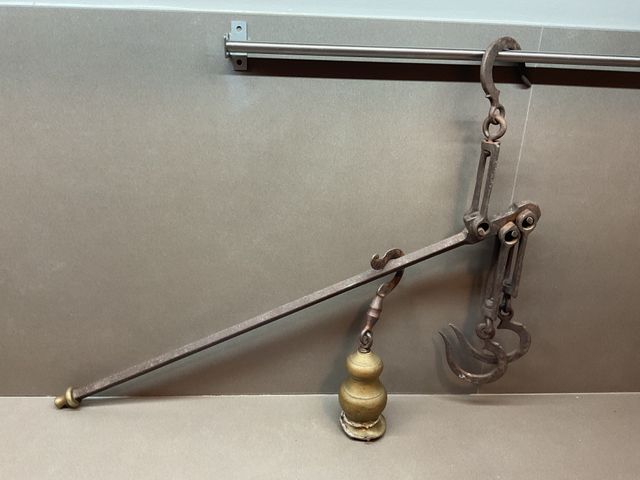 Romana antigua de hierro con su peso bañado en bronce, bien conservada pero con óxido . ́Medida : 56 cm . Pesa hasta 80 quilos