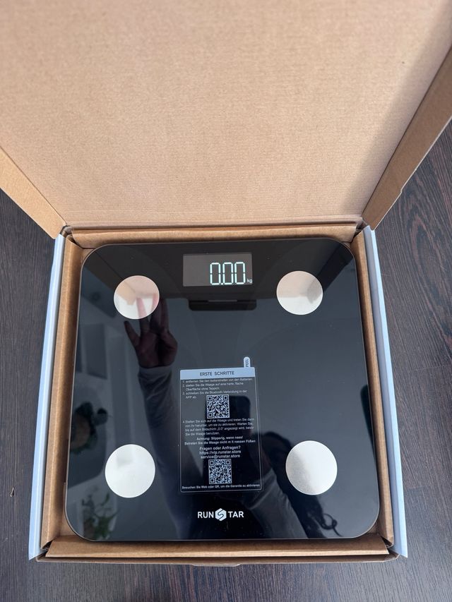 Detalles del productoBáscula inteligente RunStar en vidrio templado negro, con pantalla digital. para análisis de composición corporal (13 datos diferentes de composición corporal.
