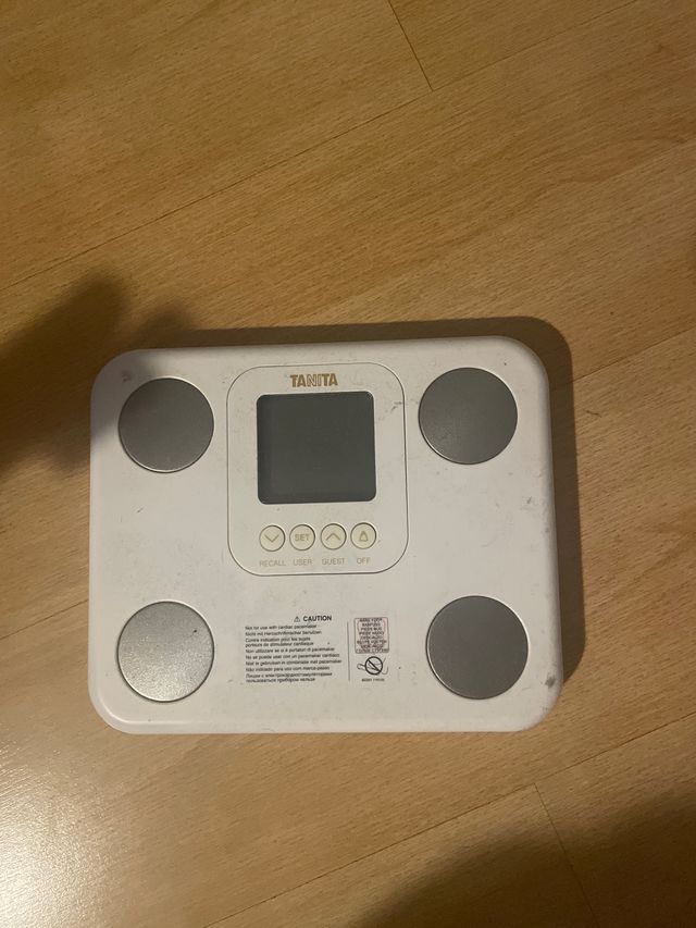 Báscula Tanita para medir el peso corporal. Está en buenas condiciones, aunque muestra señales de uso. - Marca: Tanita - Funciones: Medición de peso - Color: Blanco