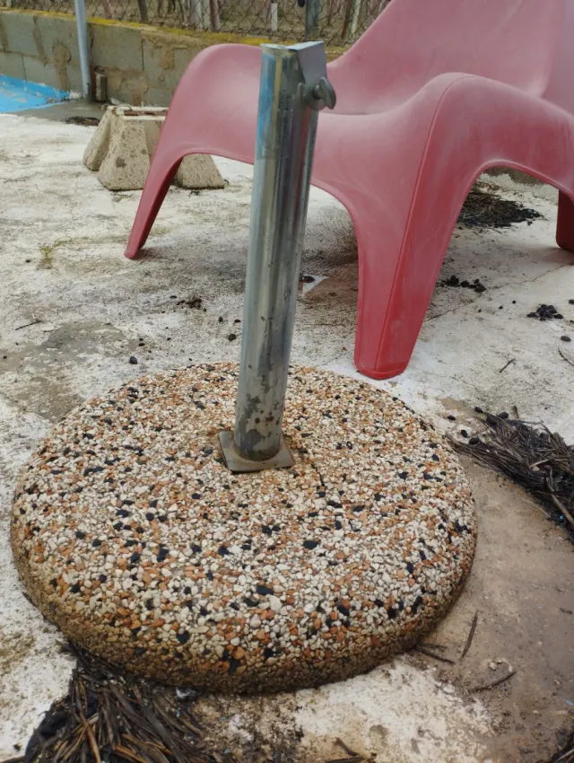 Base circular de hormigón con incrustaciones de piedra para sombrilla o parasol. Proporciona estabilidad.