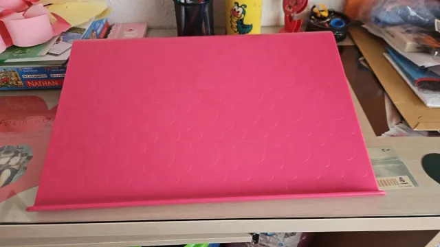 Base portátil de color rosa con un diseño de círculos en relieve. Es ideal para colocar libros o tablets. - Color: Rosa - Diseño: Círculos en relieve