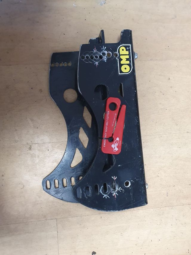 Se venden bases para baquets de la marca OMP. Piezas metálicas negras con detalles de la marca. TENGO DOS PARES. - Diseño con múltiples orificios para ajuste. - Logo OMP visible.