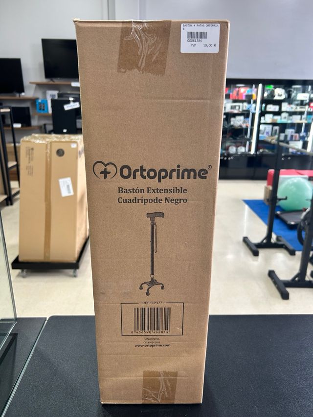 Bastón extensible de la marca Ortoprime con base de cuatro patas. Color negro.