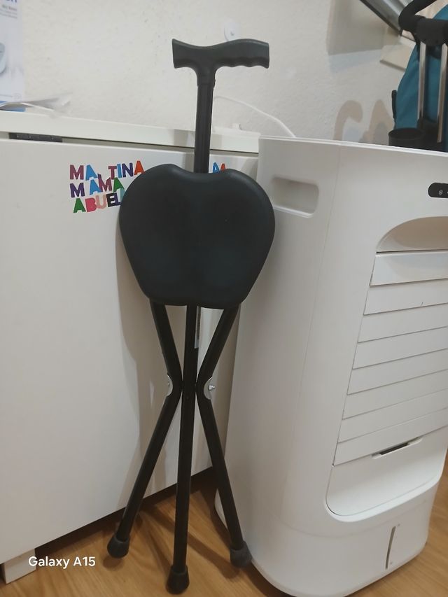 Vendo bastón de tres patas con asiento integrado. Es negro y, en perfecto estado. - Soporta hasta 100 kg. - Plegable y fácil de transportar.