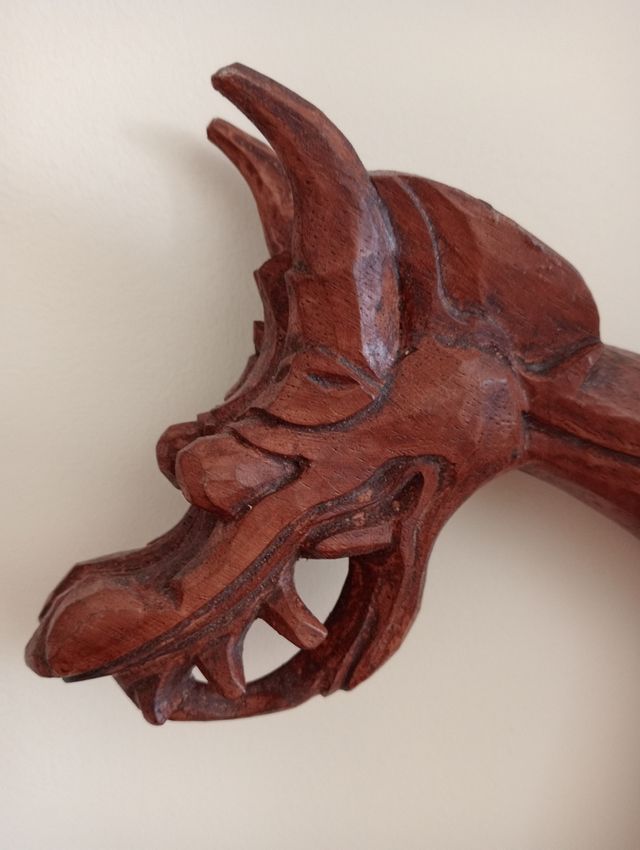 Detalles del productoPreciosa pieza de artesanía. Un bastón de madera con una cabeza de dragón tallada con detalles cuidados. Elaborado en madera, que no pesa, de color canela oscura. Ideal indumentaria medieval y recreación histórica.