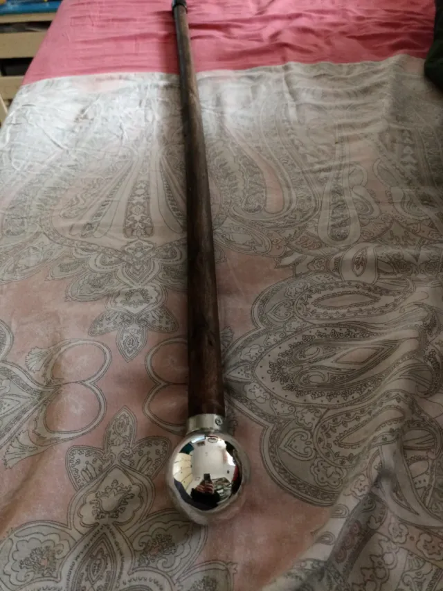 Bastón con un diseño elegante y un mango esférico. 87 cm alto - Mango con acabado plateado brillante. - Palo de madera oscura.