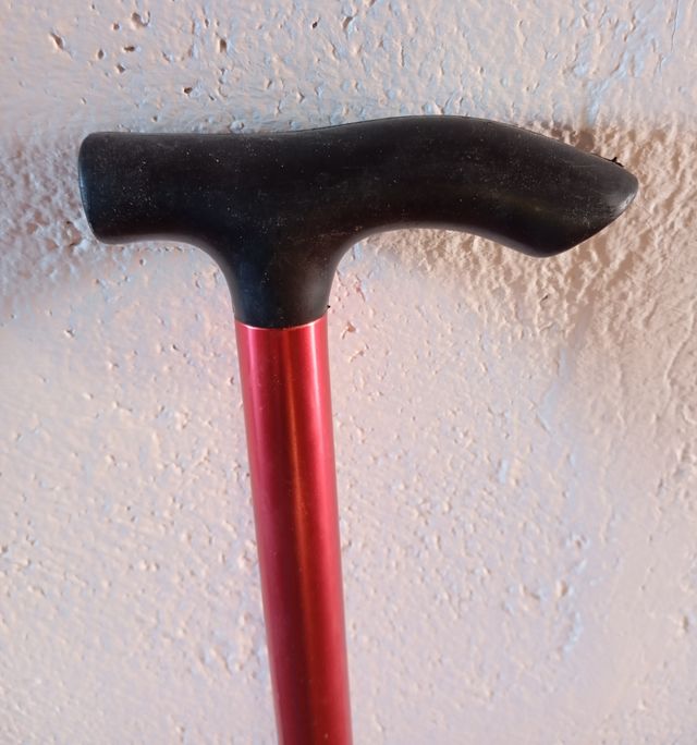 Bastón ligero y resistente de aluminio. - Empuñadura ergonómica negra. - Caña de color rojo. - Diseño moderno y funcional.