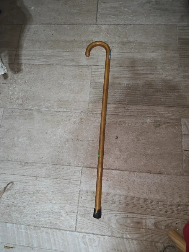 Detalles del productoBastón de madera con un diseño clásico y funcional. Su empuñadura curva ofrece un agarre cómodo.