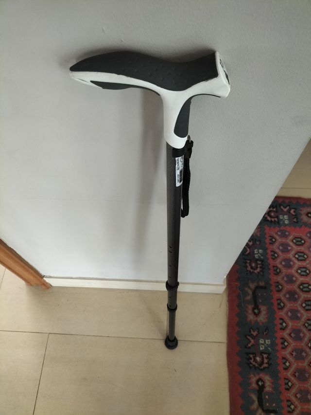 Detalles del productoBastón FDI con un diseño moderno en blanco y gris. Es ajustable en altura para mayor comodidad.