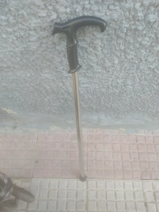Bastón con empuñadura ergonómica y diseño moderno. - Empuñadura de color negro. - Cuerpo del bastón de color plateado.