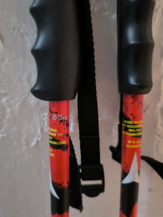 Bastones de esquí con empuñadura ergonómica. - Fabricados en aluminio. - Longitud de 85 cm. - Diseño rojo con detalles negros.