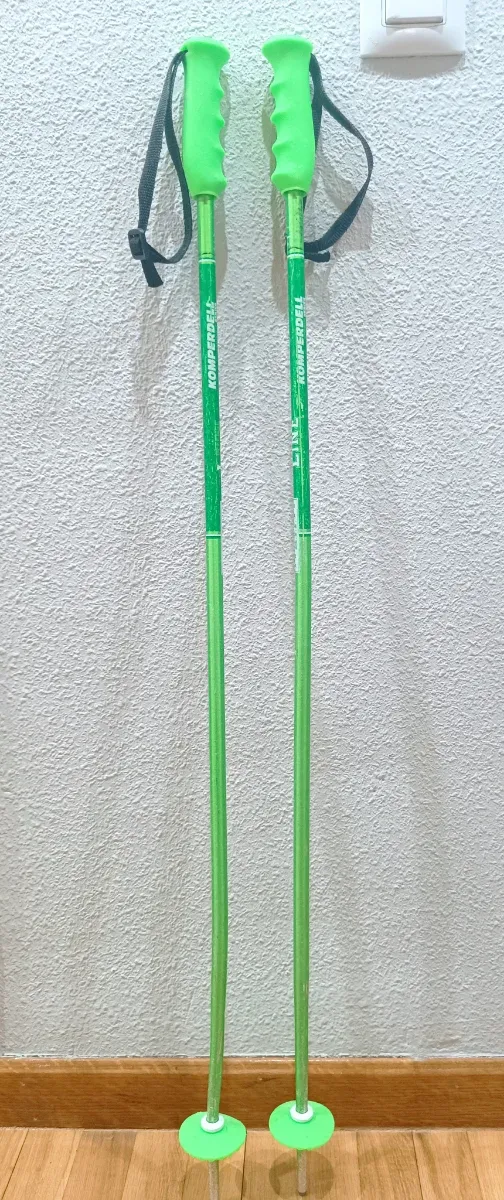 Par de bastones de esquí de la marca Komperdell. - Color verde brillante. - Empuñaduras ergonómicas. - Correas de sujeción. - Discos en la parte inferior.