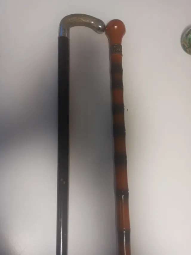 - Un bastón con empuñadura curva plateada y detalles grabados.