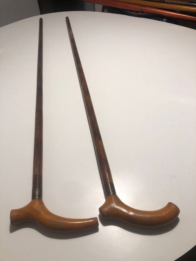 Detalles del productoMuy cómodo agarre en mano- puño de boj- vara de palma ligera y resistente. -anilla latón de dos colores - contera de goma. -ligero y resistente.- 30€cada uno.- 55€ los dos.