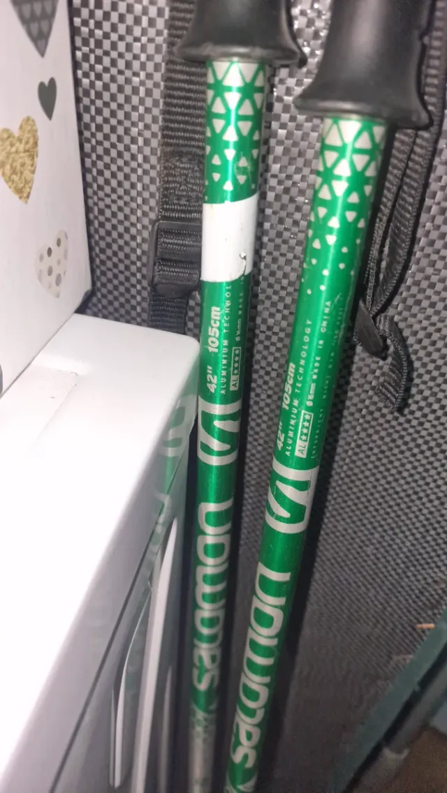 Bastones de esquí Salomon de aluminio. - Color verde con diseño. - Medida de 105cm (42). - Fabricados en China.