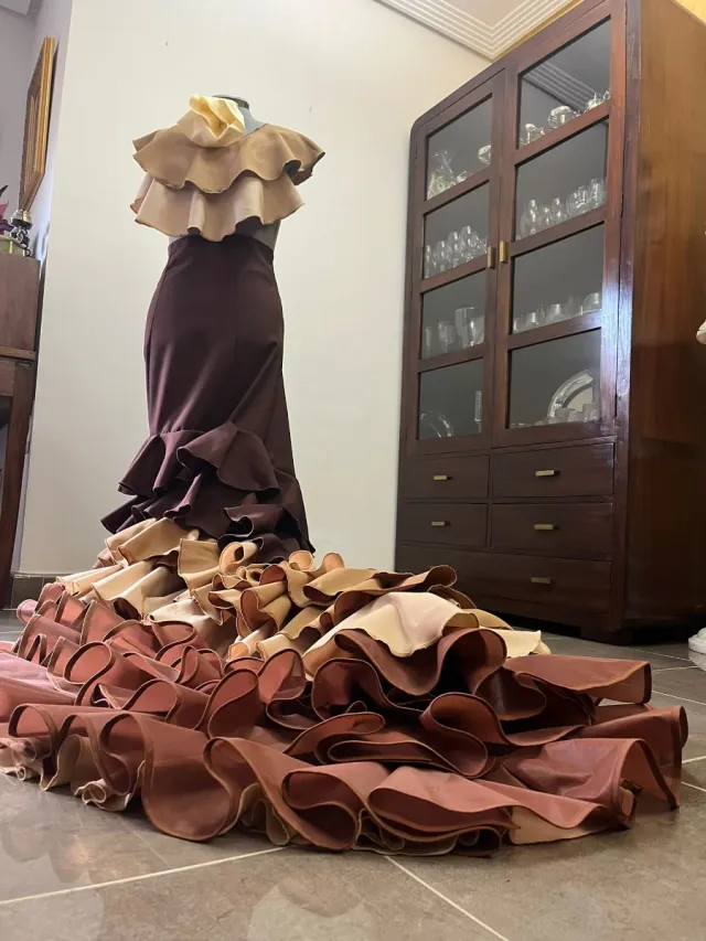 Bata de cola flamenca marrón y beige