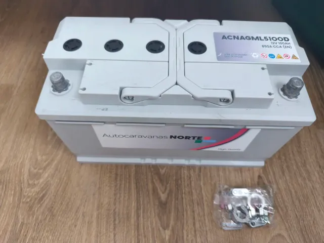 Batería AGM de 12V y 100Ah para autocaravanas, furgonetas y caravanas. Nueva sin usar. Terminales de batería en bolsa sin abrir.