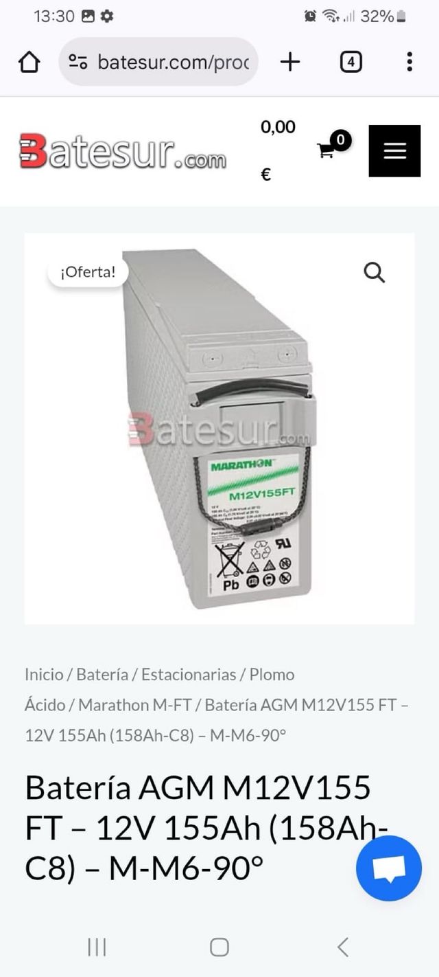 Batería AGM Marathon M12V155FT de 12V y 155Ah. - Voltaje: 12V - Capacidad: 155Ah (158Ah-C8) - Terminales: M-M6-90° - Tipo: Plomo-Ácido AGM