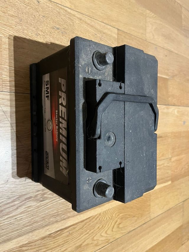Batería de coche SMF Premium está sucia pero está sin usar.