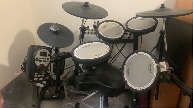 Batería electrónica de percusión Roland. - Módulos de sonido. - Pads de percusión. - Platillos. - Pedal. - Asiento.