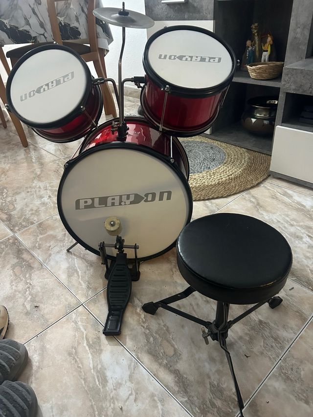 Batería infantil de la marca Play On, ideal para los más pequeños. - Color rojo brillante. - Incluye bombo, caja, dos toms y platillo. - Incluye banqueta y pedal de bombo.