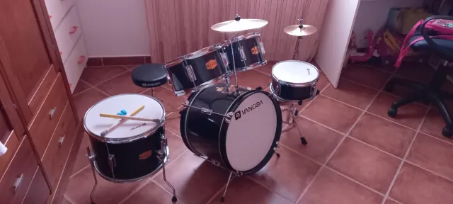 Batería junior de color negro, ideal para iniciarse en la música. - Bombo de 16 pulgadas. - Incluye banqueta. - Platillos. - Baquetas.