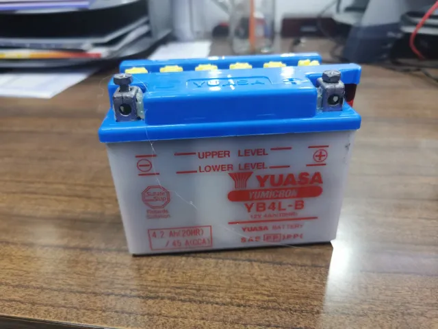 Batería de moto marca Yuasa, modelo YB4L-B. - Capacidad: 4.2 Ah (20HR). - Corriente de arranque en frío (CCA): 45 A. - Voltaje: 12V.