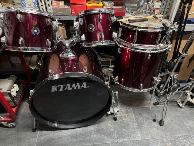 Conjunto de batería Tama en un llamativo color burdeos. Ideal para músicos. - Bombo con parche TAMA. - Toms de diferentes tamaños. - Acabado brillante.