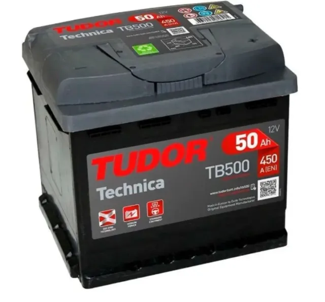 Batería de coche TUDOR TB500. - Capacidad: 50 Ah. - Voltaje: 12V. - Potencia de arranque en frío (EN): 450A.