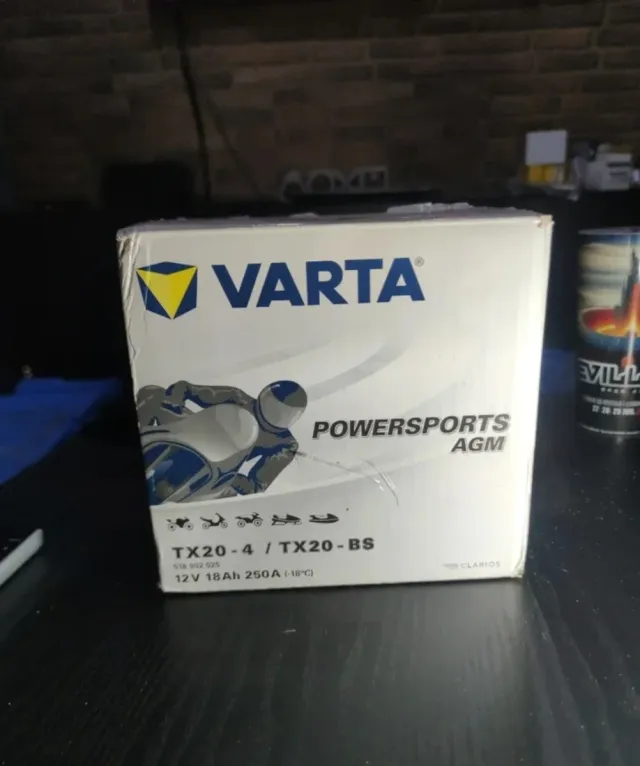 Batería Varta Powersports AGM. - Modelo: TX20-4 / TX20-BS - Voltaje: 12V - Capacidad: 18Ah - Corriente de arranque en frío (CCA): 250A (-18°C)