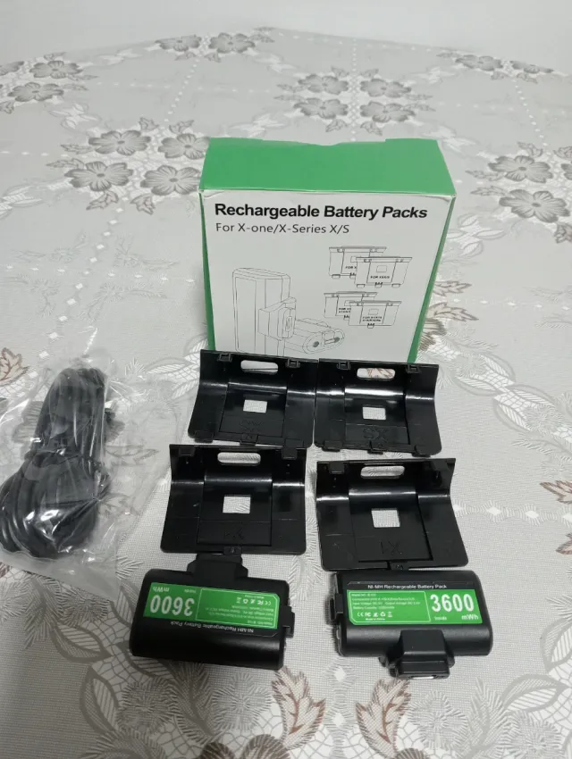 Pack de baterías recargables para mandos de Xbox. - Incluye 2 baterías de 3600 mAh. - Incluye 4 soportes de carga. - Incluye cable de carga.