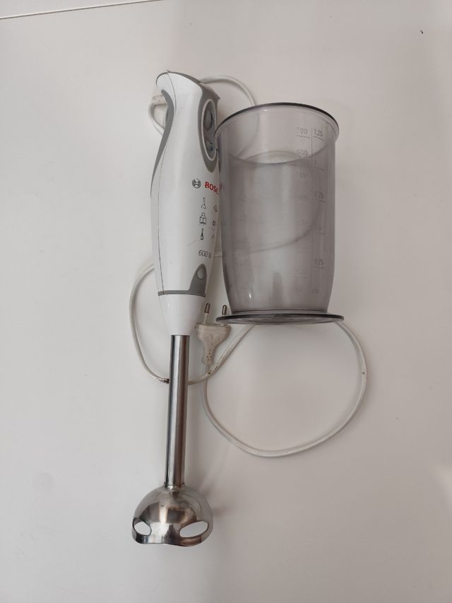 Detalles del productoBatidora de mano de la marca Bosch, con una potencia de 600W. Incluye vaso medidor. Tan solo tiene un defecto estético, una pequeña quemadura del plástico del cable por contacto con la vitroceramica (última foto)