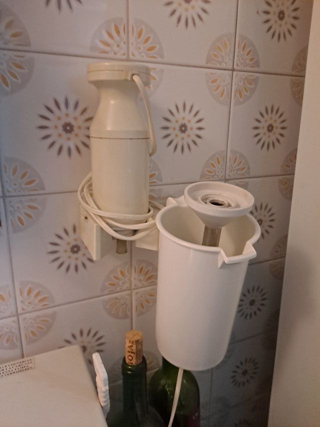 Batidora de pared marca Braun con diseño clásico y vaso original incluido. Perfecta para uso doméstico, con soporte integrado para fácil instalación en la cocina. Funcionando correctamente y en buen estado general.