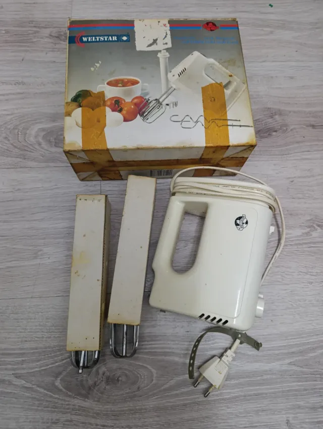 Detalles del productoBatidora de varillas de cocina de la marca Weltstar. Incluye el cuerpo principal de la batidora, dos varillas para batir y dos varillas para amasar.