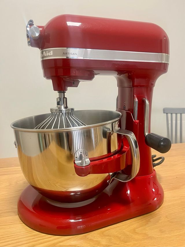 Detalles del productoBatidora de pie KitchenAid Artisan en color rojo, con capacidad de 6.9 litros, ideal para masas grandes, panes y pasteles. Se encuentra en excelente estado, muy poco uso. Única dueña. Ideal para amantes de la repostería, panadería o uso semiprofesional.