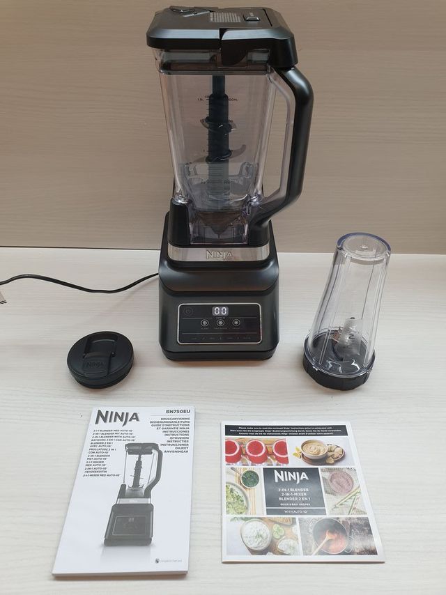Detalles del productoBatidora Ninja 2 en 1 prácticamente nueva. Incluye vaso mezclador grande, vaso pequeño para batidos y tapa. Es de color negro y tiene un diseño elegante.