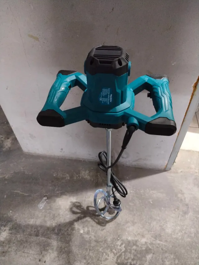 Detalles del productoBatidora eléctrica de color turquesa y negro, ideal para mezclar materiales.