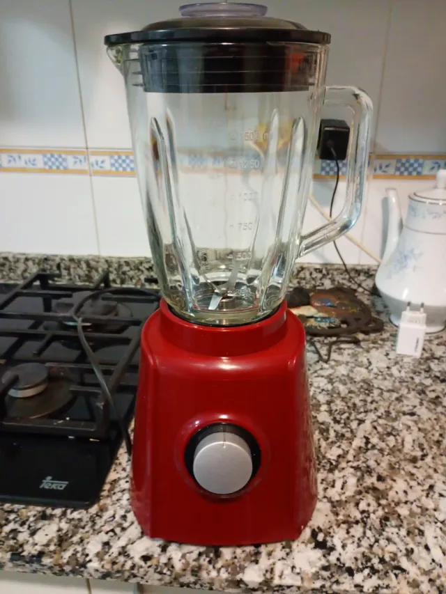 Detalles del productoBatidora de vaso con base roja y jarra de cristal.